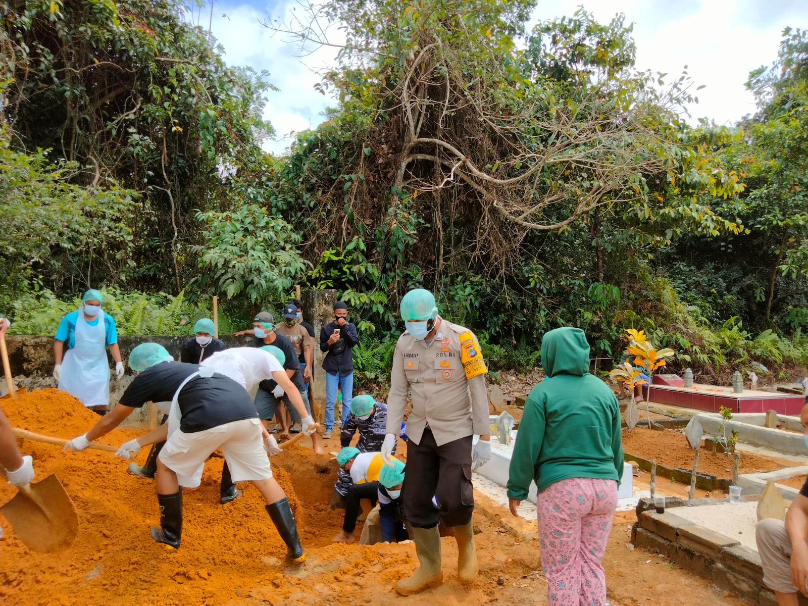 Bhabinkamtibmas Desa Sekar Biru Bripka Asep Hidayat hadir dalam prosesi pemakaman jenazah pasien Covid-19 dan turut berlangsung kawah atas meninggalnya pasien yang terpapar Covid-19 an all SA