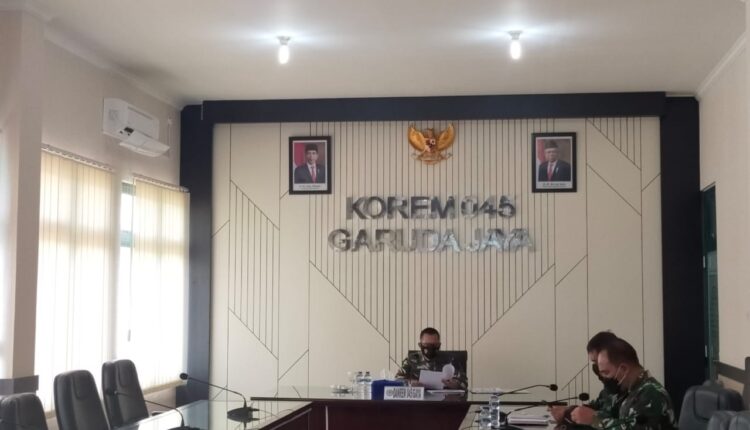 TerabasNews, Pangkalpinang, Penrem 045/Garuda Jaya. Danrem 045/Gaya Brigjen TNI M Jangkung Widyanto, S.I.P., M.Tr (Han) Melaksanakan Rapat tentang Evaluasi Penanganan Pandemi Covid-19 dan Vaksinasi bersama Panglima TNI secara virtual di Makorem 045/Gaya Komplek Perkantoran Provinsi Kel. Air Itam Kec. Bukit Intan Kota Pangkalpinang Selasa 14/09/2021.