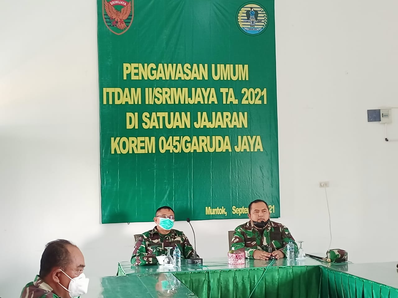 Rangkaian acara pelaksanaan kegiatan Pengawasan umum ITDAM II/Sriwijaya TA. 2021 bertempat di Makodim 0431/Babar satuan jajaran korem 045/Garuda Jaya diawali dengan acara pembukaan, kata sambutan Komandan Kodim 0431/Bangka Barat Letkol Inf Agung Wahyu Perkasa,S.Sos, kata sambutan Ketua Tim Kolonel CZI Komaruddin, S.Sos.,M.M, pemeriksaan terkait pelaksanaan Program Kerja dan Anggaran Kodim 0431/Babar yang telah dilaksanakan sampai dengan Triwulan III TA 2021, pengecekan gudang senjata, Makan siang bersama, Pengecekan Rumah dinas, dan dilanjutkan kegiatan pengawasan uji petik bertempat di Koramil 431-02/Muntok, kegiatan selesai