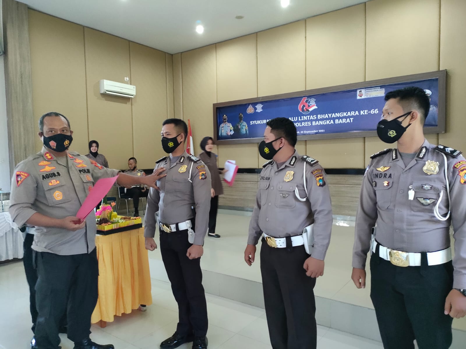 Kapolres Bangka Barat AKBP Agus Siswanto SH.SIK.MH memimpin kegiatan syukuran Hari Lalu Lintas Bhayangkara. Dalam kesempatan tersebut juga kapolres memberi penghargaan kepada anggota yang berprestasi dan pemotongan tumpeng.