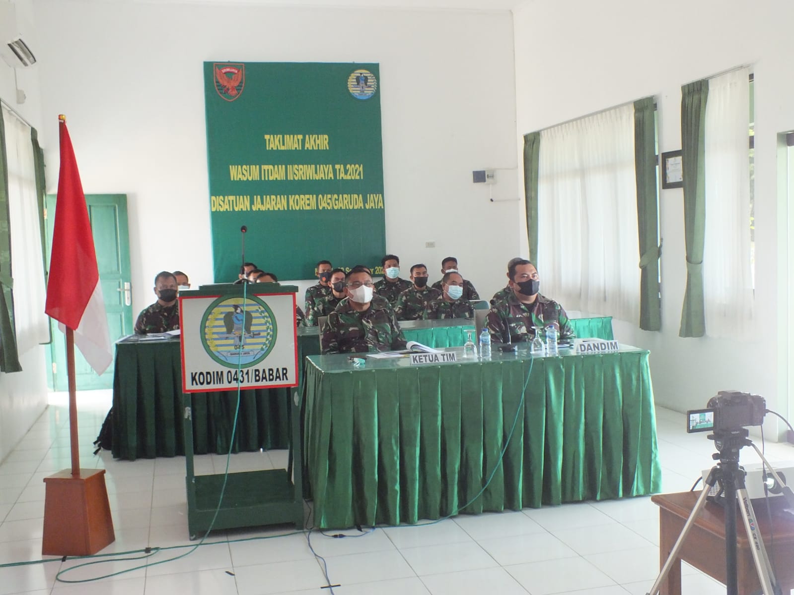 Kodim 0431/Babar Melaksanakan kegiatan Taklimat Akhir WASUM ITDAM II/SWJ TA.2021 di Kodim 0431/Bangka Barat Satuan Jajaran Korem 045/Gaya Kegiatan di Pimpin oleh Ketua Tim Kolonel CZI Komaruddin, S.Sos.,M.M