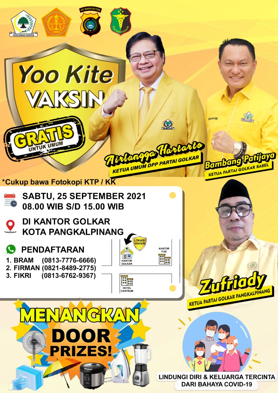 Ketua DPD Partai Golkar Kota Pangkalpinang yang baru saja terpilih, Dr. Zufriady menyebutkan, pihaknya melaksanakan vaksinasi gratis bertempat di Kantor Golkar Pangkalpinang, Kelurahan Batin Tikal, Kecamatan Taman Sari tepatnya di depan Hotel Centrum, dengan menyediakan dooprize menarik bagi yang ikut serta dalam kegiatan tersebut.