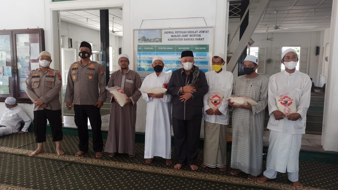 Dalam kesempatan ini Kapolres Bangka Barat beserta jajarannya membagikan sembako sebanyak 50 paket beras kepada jamaah masjid Jami Mentok