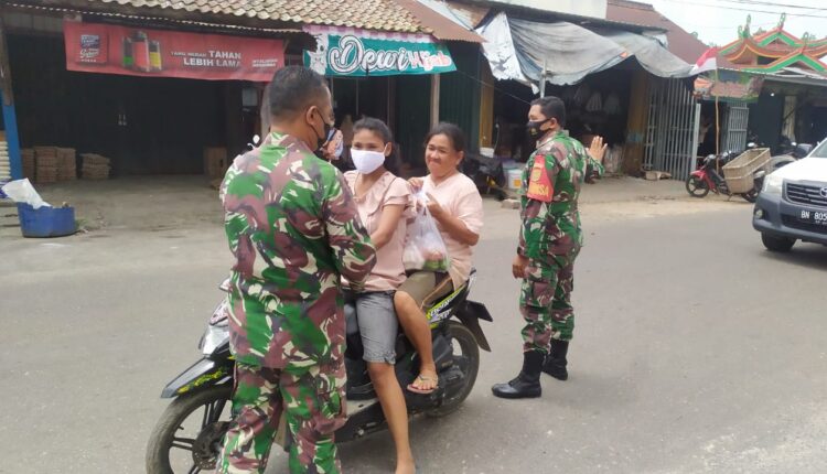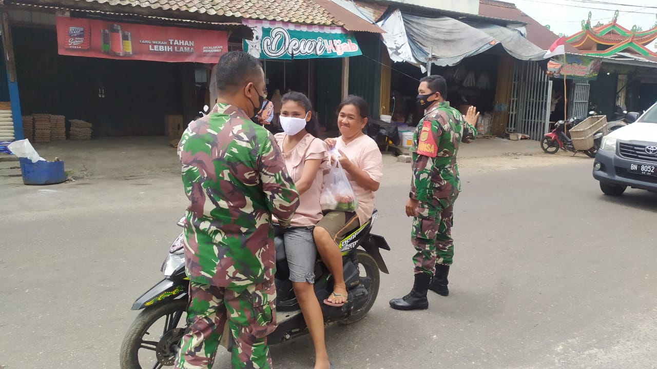 Babinsa Koramil 431-01/Jebus Bagikan Masker gratis kepada Masyarakat di Pasar Tradisional dan di sepanjang jalan
