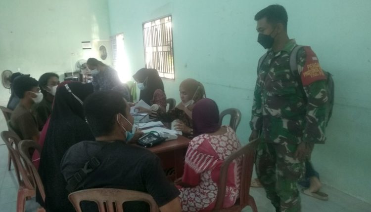 Pastikan Program pemerintah berjalan lancar, Babinsa Koramil 431-03/Kelapa monitoring Vaksinasi tahap I di Desa Binaan