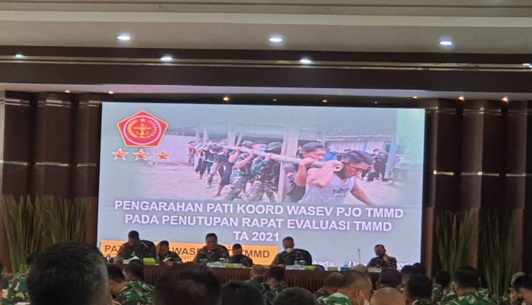 “Evaluasi TMMD dapat menjadi komitmen kita bersama untuk meningkatkan kinerja dan sinegritas guna membantu Pemerintah dalam percepatan pembangunan di Daerah untuk meningkatkan kesejahteraan Rakyat demi terwujudnya rakyat juang yang tangguh.” Tuturnya