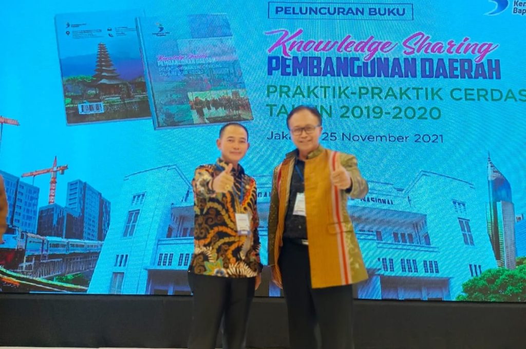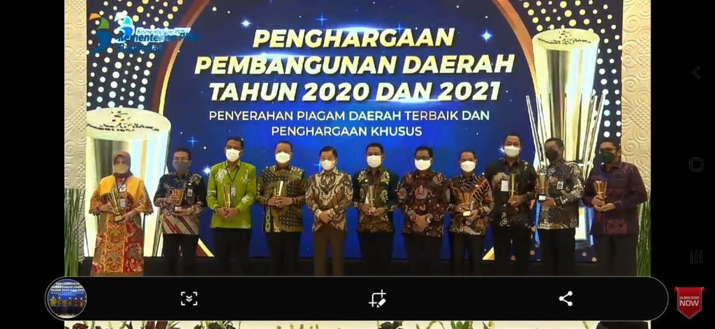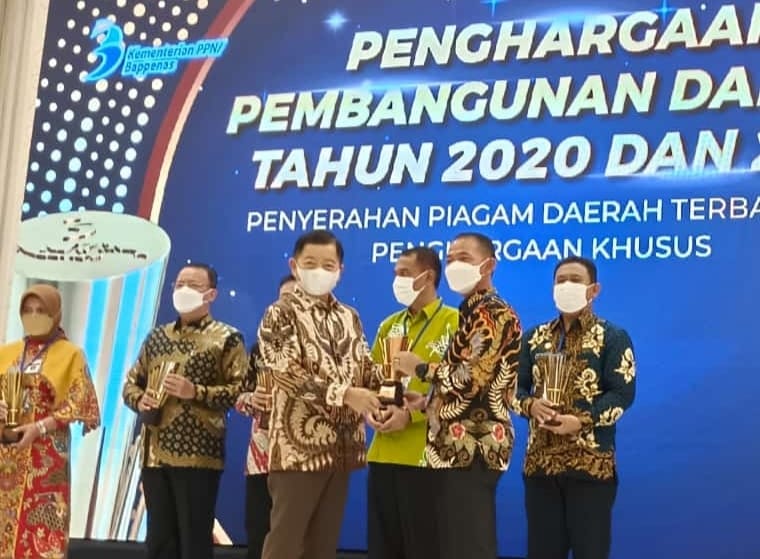 Penyerahan penghargaan tersebut diserahkan langsung oleh Menteri Bappenas RI, Suharso Monoarfa dan diterima Bupati Bangka, Mulkan SH,MH saat peluncuran “buku knowledge sharing pembangunan daerah” di ruangan DH 1-5 Bappenas yang disiarkan melalui aplikasi zoom di Rumah Dinas Bupati Bangka, Kamis (25/11).
