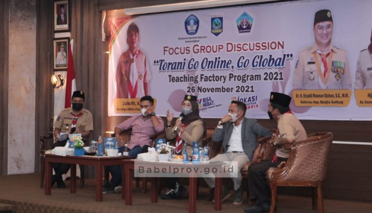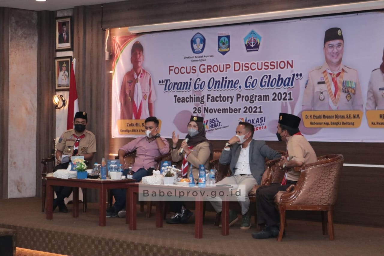 Demikian disampaikan Ketua Kwartir Daerah Gerakan Pramuka Provinsi Kepulauan Bangka Belitung (Kakwarda Babel), Melati Erzaldi saat membuka dan memberikan materi dalam kegiatan Focus Group Discussion “Torani Go Online, Go Global” Teaching Factory Program 2021, di Ruang Pasir Padi, Kantor Gubernur, Jumat (26/21/21).
