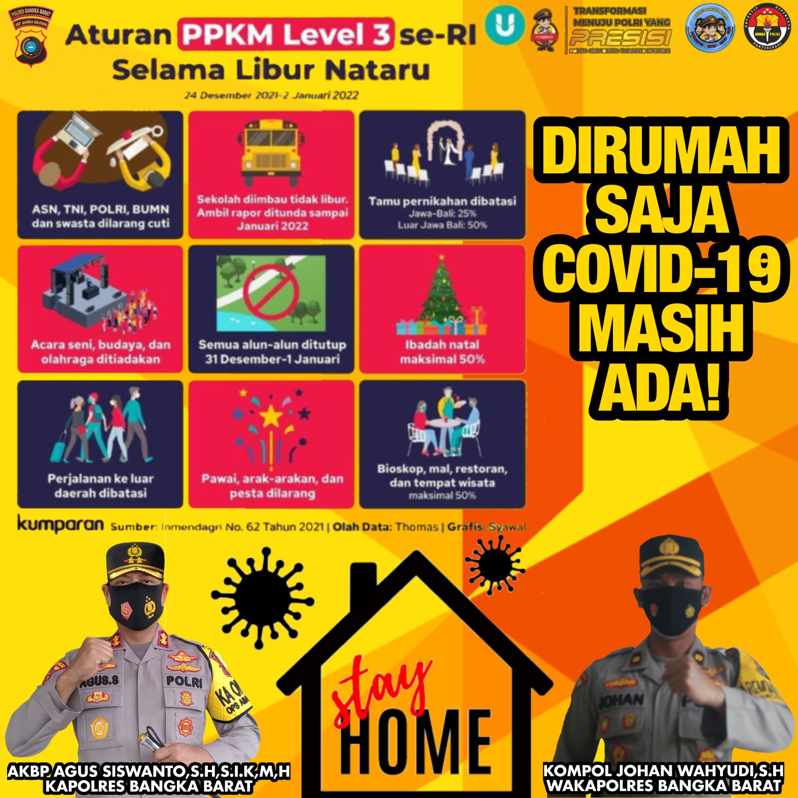 “PPKM level 3 diperketat jelang Nataru dimulai tanggal 24 Desember 2021 hingga 2 Januari 2022, demi keselamatan bersama dan mengantisipasi lonjakan penyebaran Covid-19. Masyarakat pun diimbau untuk tetap dirumah saja,” ungkap Kapolres Bangka Barat AKBP Agus Siswanto SH.SIK.MH. senin (06/12/2021)