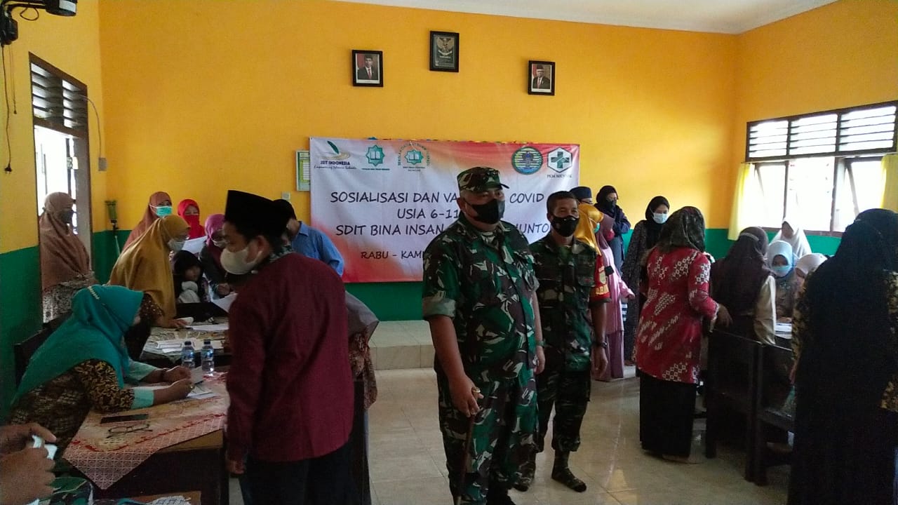 Komandan Kodim 0431/Bangka Barat Letkol Inf Agung Wahyu Perkasa, S.Sos meninjau Sosilisasi dan Vaksinasi Covid-19 Usia 6-11 Tahun yang di Gelar oleh Kodim 0431/Bangka Barat bertempat di SDIT Bina Insan Cendikia Muntok Jumlah anak yang di Vaksin hari ini 132 anak Usia 6-11 Tahun.Kamis (23/12/2021)