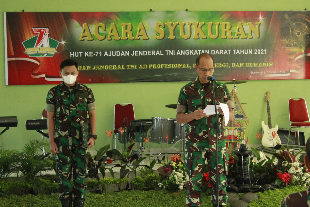 TerabasNews, Semarang – Kepala Ajudan Jenderal Kodam (Kaajendam) IV/Diponegoro Kolonel Caj Drs. Susanto, M.A.P. memimpin acara syukuran memperingati HUT ke-71 Korps Ajudan Jenderal (Ajen) TNI AD, bertempat di Mako Ajendam IV/Diponegoro, Jl. Perintis Kemerdekaan, Watugong, Jum’at (31/12/2021).