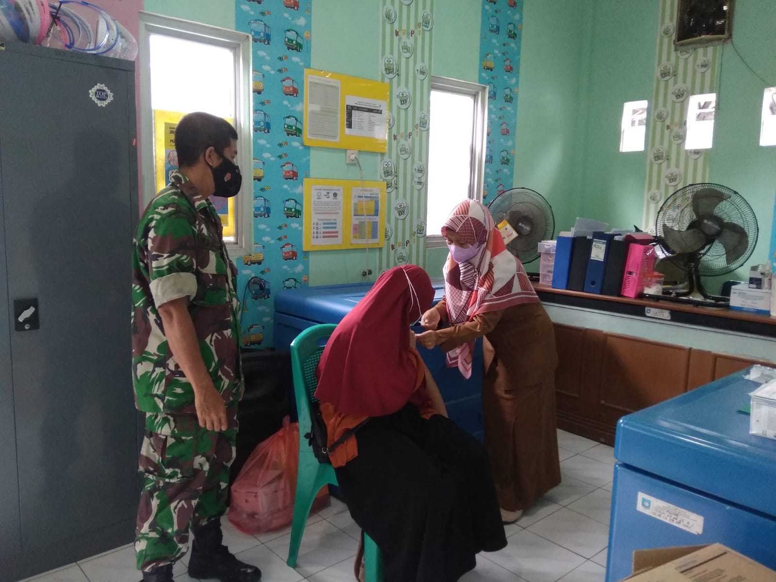 Sertu Tamin, Serda Erwin Marpaung babinsa Koramil 431-02/Muntok, dan Praka Azwar anggota Kesehatan Kodim 0431/Bangka Barat bersama Tim Nakes dar Puskesmas Muntok melaksanakan Vaksinasi tahap I dan II dengan jenis Vaksin yaitu jenis Sinovac. Sabtu, (08/01/22)