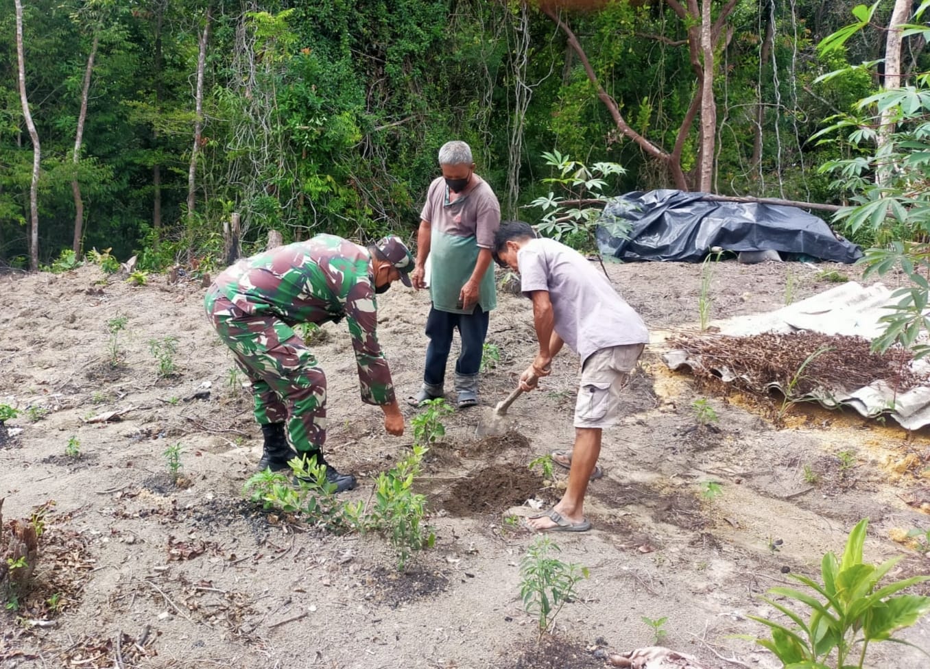 TerabasNews, Pangkal Beras, Bangka Barat – Serda Budi Suseno ,Babinsa Koramil 431-03/ kelapa melaksanakan Komsos di desa pangkal Beras di tempat lahan tanah Bapak mahmud, dilahan tersebut beliau berencana untuk menanami ubi kayu,dari hasil penjualan ubi kayu Tersebut pak Mahmud dapat memenuhi kebutuhanya sehari-hari. Selasa, (01/02/2022)