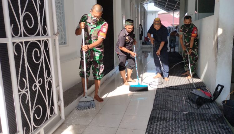 TerabasNews, Aceh Barat – Anggota Koramil 07/Johan Pahlawan Kodim 0105/Abar Serda Agustino dan Koptu Jainuddin serta bersama dengan Badan Kemakmuran Masjid (BKM) maupun masyarakat tampak kompak membersihkan Masjid AL – Mabrur yang ada di Desa Ujong Kalak Kecamatan Johan Pahlawan, Jum’at (25/2/2022)