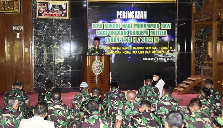 Segenap Organik Akademi Militer, baik Militer dan Pegawai Negeri Sipil mengikuti acara peringatan Isra Mikraj Nabi Agung Muhammad SAW Tahun 2022, dengan penceramah KH. DR. Mahsun Mahfud, M.Ag.,(Dosen UIN Walisongo Semarang) bertempat di Masjid Al Jihad Kesatrian Akademi Militer, Rabu (09/03/2022).