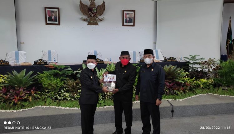 TerabasNews, Sungailiat – Rapat paripurna Dewan Perwakilan Rakyat Daerah (DPRD) Kabupaten Bangka pada penyampaian Laporan Keterangan Pertanggungjawaban (LKPJ) Bupati Bangka tahun 2021 berlangsung di ruang mahligai DPRD, Senin (28/03).