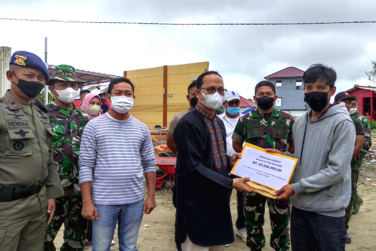 TerabasNews, Pangkalan Baru – Sabtu (09/04/2022), Bupati Bangka Tengah (Bateng), Algafry Rahman memberikan bantuan biaya perawatan kepada salah satu korban akibat dampak musibah angin puting sebesar Rp 10.586.000,- di Desa Kebintik, Kecamatan Pangkalan Baru.