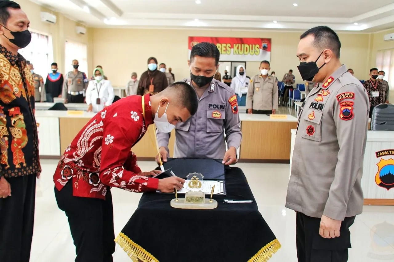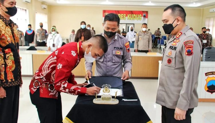 TerabasNews, Kudus – Polres Kudus hari ini menggelar sumpah sekaligus penandatanganan Pakta Integritas Rekrutmen Penerimaan Anggota Bintara dan Akpol Polri Tahun 2022 di Aula Parama Satwika Polres Kudus yang dipimpin langsung Kapolres Kudus AKBP Wiraga Dimas Tama, S.I.K., M.Si, Kamis (14/4/2022).