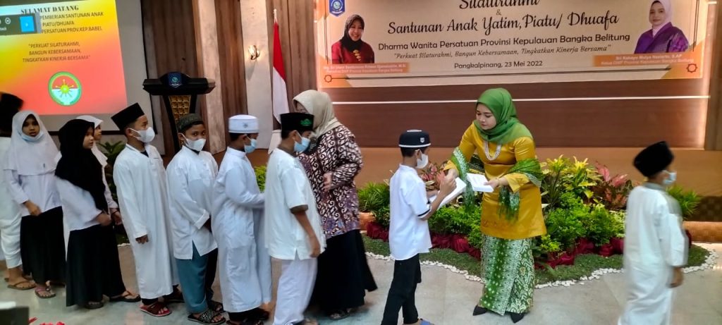 TerabasNews, Pangkalpinang – Darma Wanita Persatuan (DWP) Provinsi Kepulauan Bangka Belitung kembali laksanakan kegiatan silaturahmi serta pemberian santunan kepada 130 anak yatim piatu dan kaum dhuafa serta membantu 4 yayasan panti asuhan, bertempat di ruang Pasir Padi kantor Gubernur Babel, Senin, 23/5.