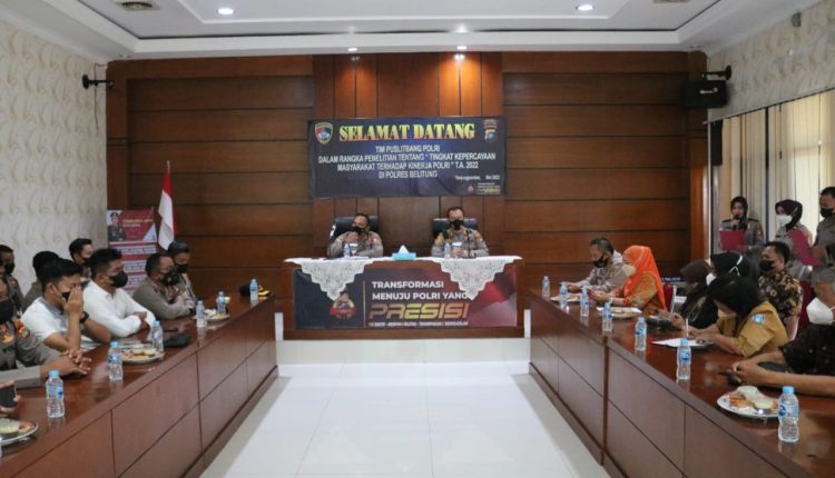 TerabasNews – Tim Pusat Penelitian dan Pengembangan Kepolisian Republik Indonesia (Puslitbang Polri) menggelar penelitian tentang tingkat kepercayaan masyarakat terhadap kinerja Polri tahun 2022 di wilayah Hukum Polda Kep. Bangka Belitung.
