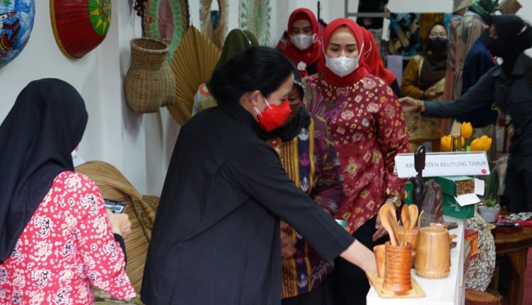 Rumah Bunda menjadi gerai pertama yang ia kunjungi di Destar Point. Tampak Puan Maharani melihat-lihat hingga memilih beragam aksesoris, batik, cual dan kerajinan lokal Bangka Belitung lainnya.