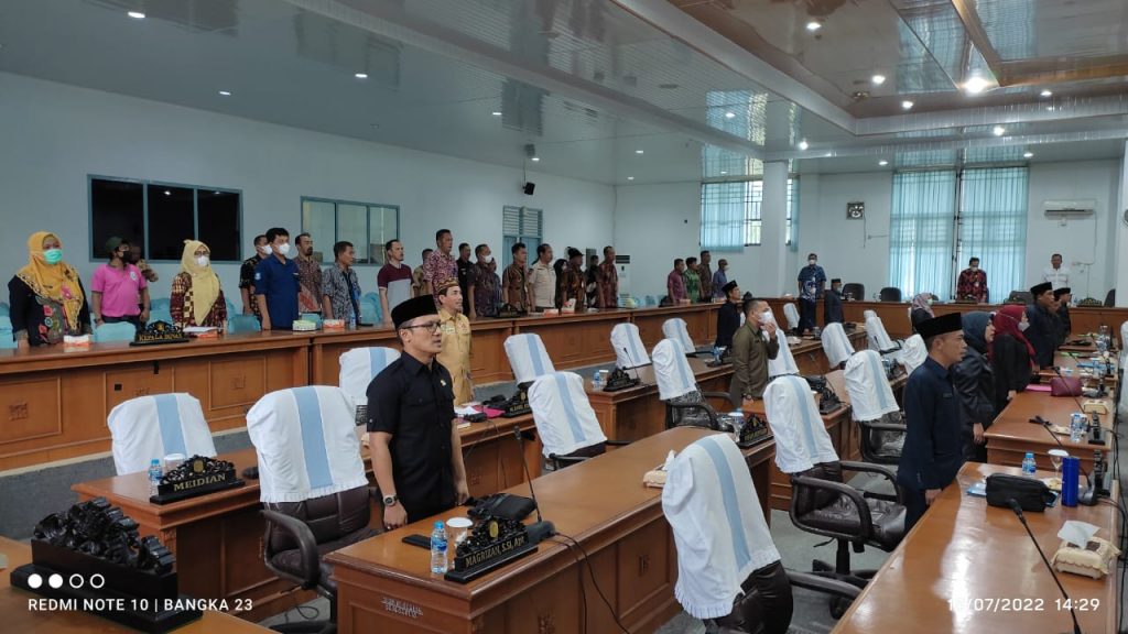 Rapat paripurna dihadiri Bupati Bangka, Mulkan SH,MH, Forkopimda, sejumlah Kepala Organisasi Perangkat Daerah (OPD), Camat, Lurah, sebanyak 23 orang Anggota DPRD yang dipimpin langsung oleh Ketua DPRD Kabupaten Bangka, Iskandar Sidi S.IP didampingi Wakil Ketua 1 Mendera Kurniawan, Wakil Ketua 2 Rendra Basri dan PLH Setwan, Al Imran berlangsung berlangsung di Ruang Mahligai DPRD Kabupaten Bangka, Jumat (15/07).