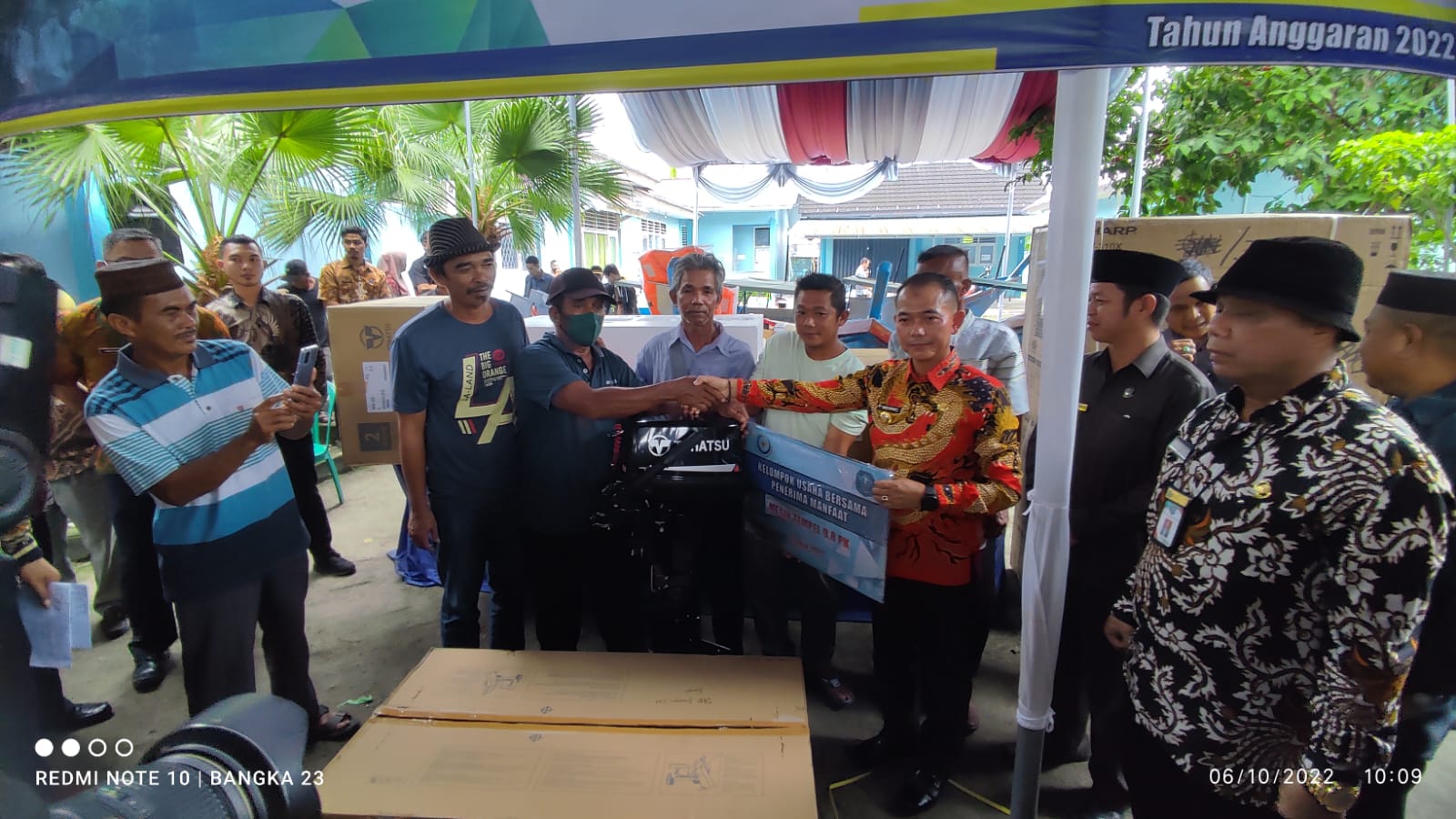 Sementara itu, Kepala Dinperkan Kabupaten Bangka, Arman Bagus menyampaikan penyerahan sarana dan prasarana kepada kelompok nelayan tersebut yakni kapal fiber glass 3 GT sebanyak 5 unit, jaring, cool box dan gps sebanyak 5 unit, mesin tempel 9,8 PK sebanyak 45 unit dan bantuan lainnya dari Kementrian Kalautan dan Perikanan untuk Pokdasarcam atau kelompok yang bergerak untuk hasil ikan sebanyak 2 unit chest freezer.