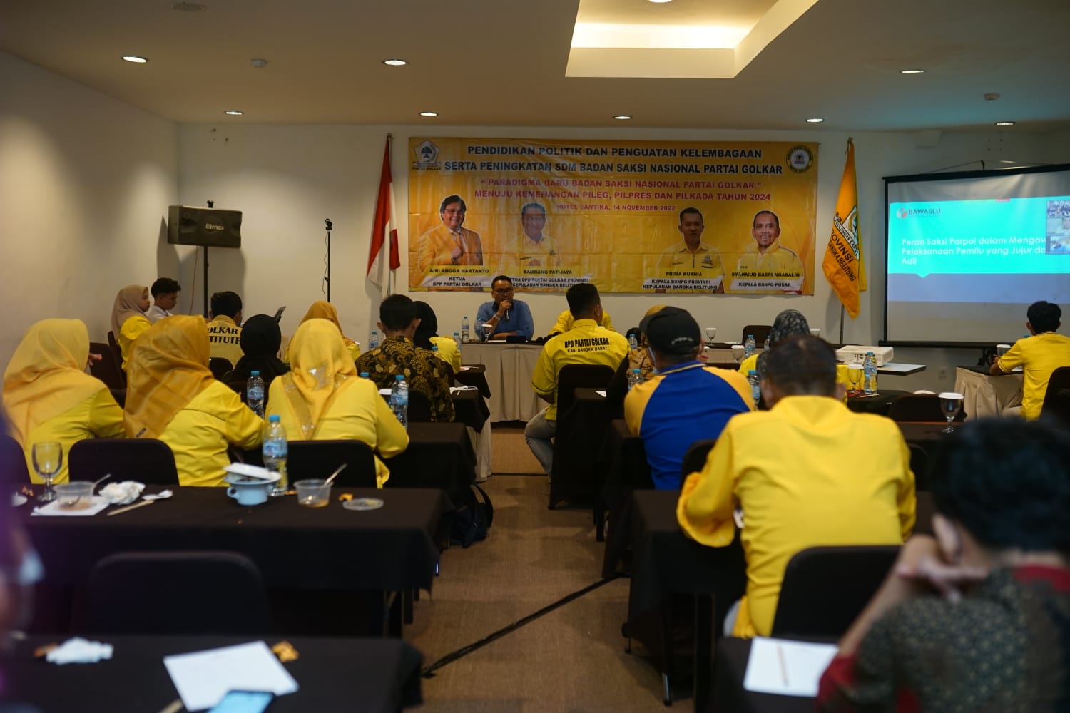 TerabasNews, Pangkalan Baru- Badan Saksi Nasional Partai Golkar (BSNPG) Provinsi Kepulauan Bangka Belitung (Babel) gelar pendidikan politik dan penguatan kelembagaan serta peningkatan SDM Badan Saksi Nasional Partai Golkar di Hotel Santika pada Senin 14 November 2022.