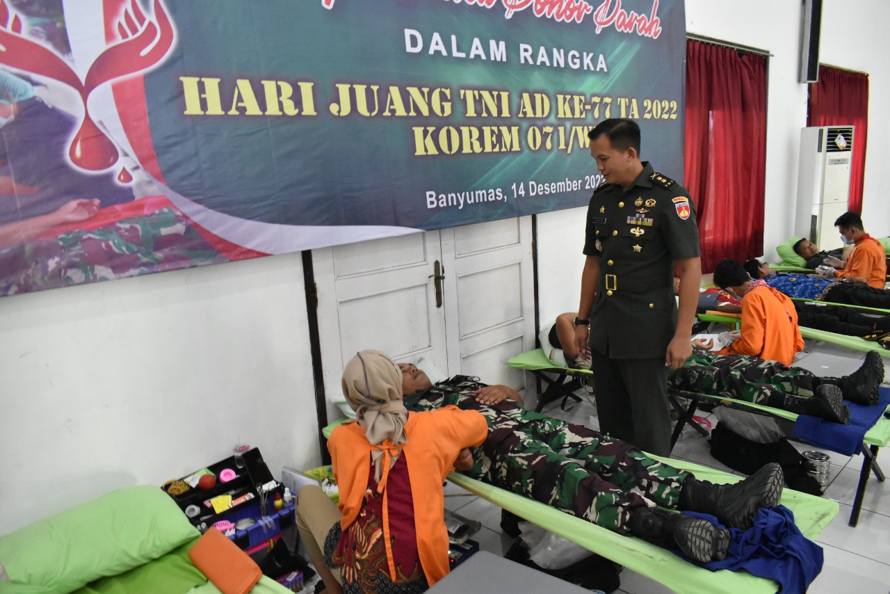 Danrem 071/Wijayakusuma Kolonel Inf Yudha Airlangga, S.E., mengatakan, bakti sosial donor darah ini disamping untuk menyemarakkan Hari Juang TNI AD juga sebagai wahana kita untuk membantu kesulitan masyarakat khususnya dalan pemenuhan kebutuhan darah diwilayah Banyumas.