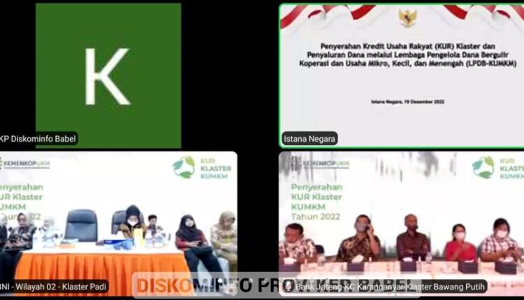 TerabasNews, PANGKALPINANG – Presiden RI Joko Widodo menyerahkan Kredit Usaha Rakyat ( KUR ) Klaster dan Pembiyaan Dana Bergulir LPDP-KUMKM dari Istana Presiden, dan kegiatan ini dilaksanakan secara virtual diikuti oleh para Menteri terkait, Gubernur, Wali Kota, Bupati dan pelaku usaha di seluruh Indonesia, Senin (19/12/22 ).