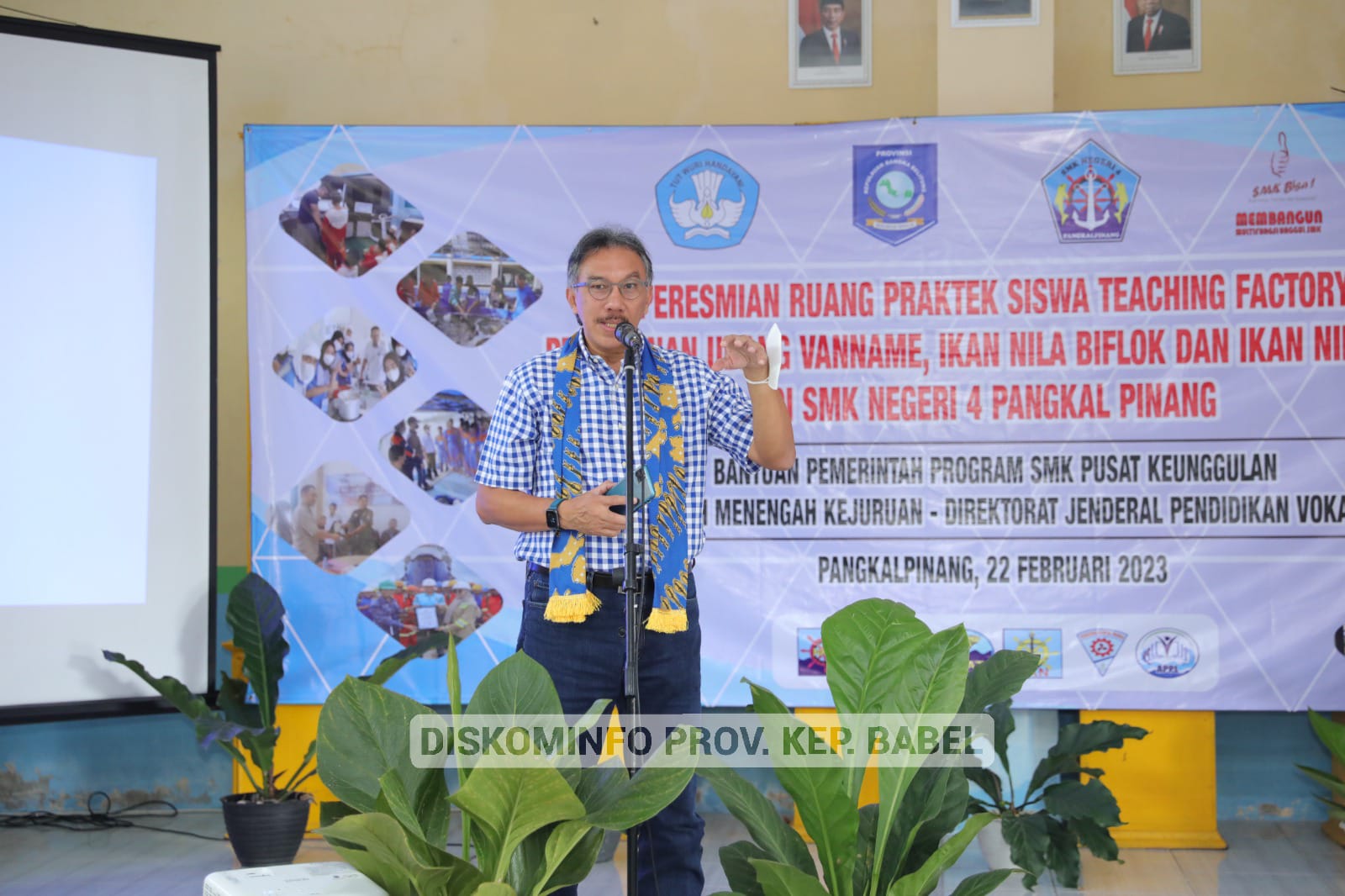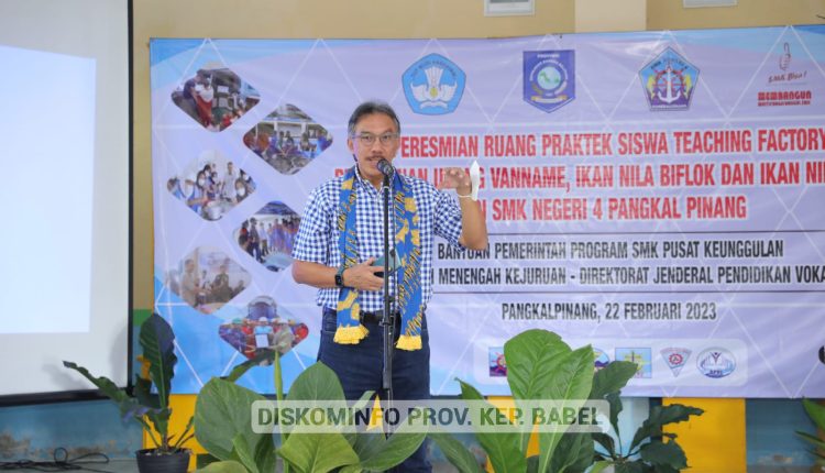 TerabasNews, PANGKALPINANG – Penjabat (Pj) Gubernur Kepulauan Bangka Belitung (Kep. Babel), Ridwan Djamaluddin menghadiri peresmian Ruang Praktek Siswa Teaching Factory Agribisnis Perikanan Air Tawar (APAT) serta melakukan panen udang vanname, ikan nila jenis biflok dan salin di SMK Negeri 4 Pangkalpinang, Rabu (22/2/23). Kedatangan orang nomor satu di Bumi Serumpun Sebalai itu disambut dengan tradisi Pedang Pora dan Tari Sambut Pinang 11 oleh taruna/i SMKN 4 Pangkalpinang,