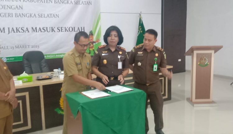 TerabasNews, Bangka Selatan – Program Jaksa Masuk Sekolah (JMS) Kejaksaan Negeri (Kejari) Bangka Selatan kembali berlanjut. Hal itu ditandai dengan penandatanganan nota kesepakatan perjanjian kerjasama dengan Dinas Pendidikan dan Kebudayaan Kabupaten Bangka Selatan.
