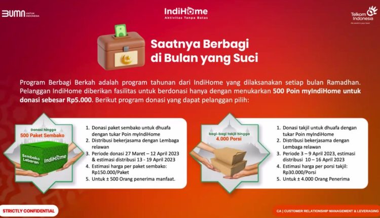 Selain itu para pelanggan juga dapat berbagi berkah dengan program tahunan dari indiHome untuk berdonasi di bulan Ramadhan dengan cara menukarkan poin MyIndihome untuk berdonasi paket sembako dan takjil bagi kaum duafa yang akan di distribusikan oleh lembaga relawan yang bekerjasama dengan IndiHome.