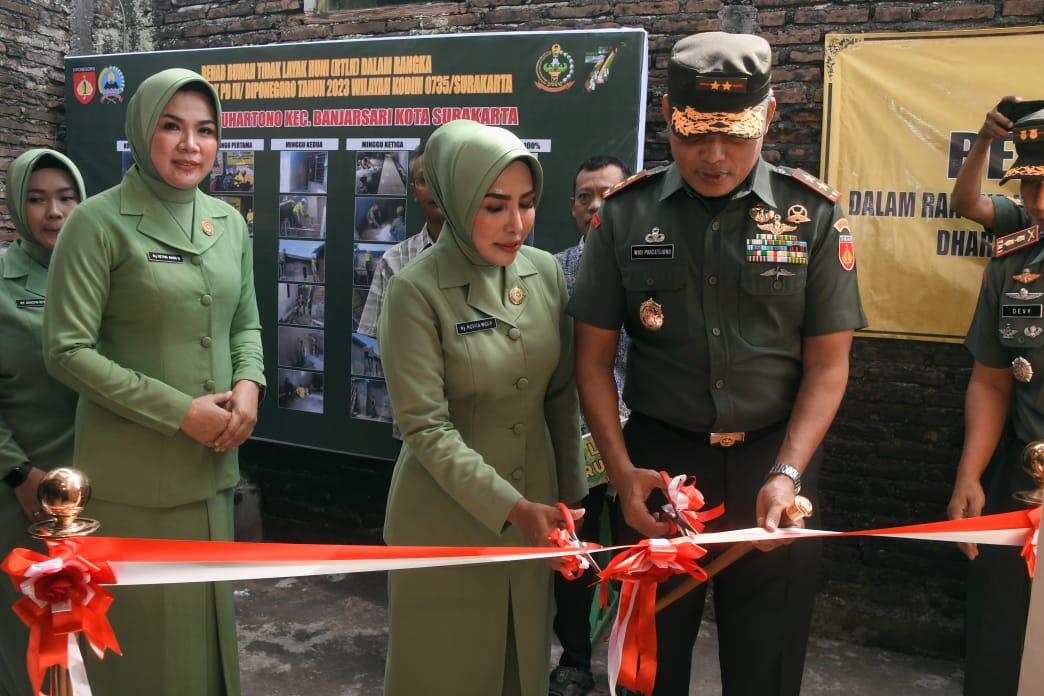 TerabasNews, Semarang – Pangdam IV/Diponegoro Mayjen TNI Widi Prasetijono bersama Ketua Persit KCK PD IV/Diponegoro Ny. Novita Widi Prasetijono resmikan hasil renovasi pembangunan 9 unit RTLH bagi masyarakat kurang mampu yang berada di wilayah Kodim 0735/Surakarta dalam rangka HUT Persit ke-77 dan Dharma Pertiwi ke-59 tahun 2023. Sabtu (8/4/2023).