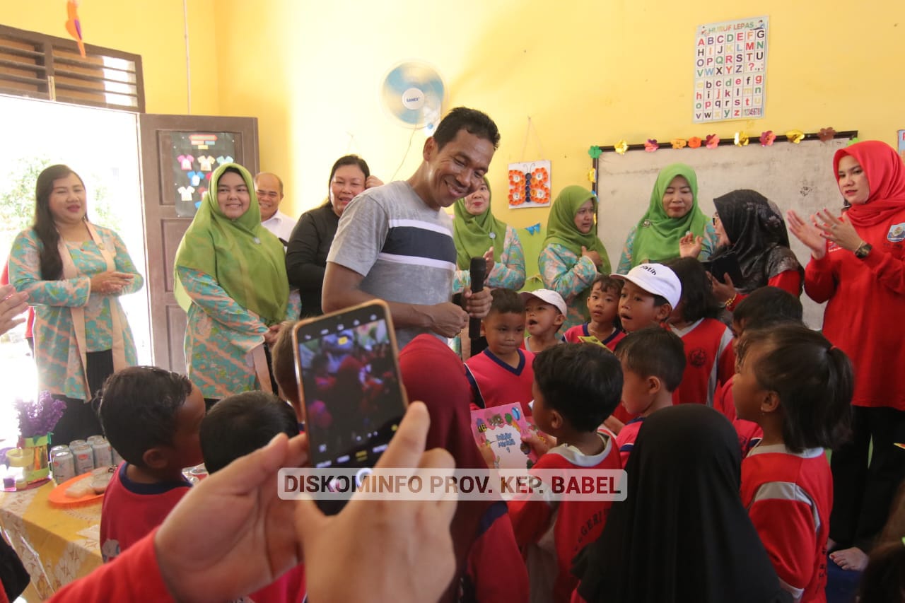 Hal itu dibuktikan dengan kehadiran keduanya di TK Negeri 2 Pembina Payung, Kabupaten Bangka Selatan pada Kamis (25/5). Sejak Pj. Gubernur Suganda dan Bunda PAUD Maya masuk ruangan kelas, anak-anak langsung berteriak senang.