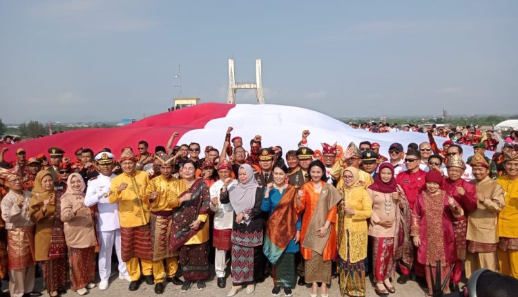 Sebelum membentangkan Bendera Merah Putih kegiatan di awali dengan upacara yang di gelar di jalan tepatnya di pinggir pantai Kwala di ujung dari jembatan Emas dengan tema “Gotong royong membangun peradaban dan pertumbuhan global”.