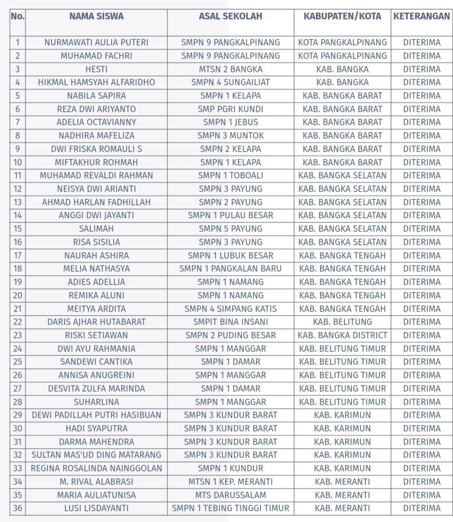 Berikut daftar nama 36 siswa yang dinyatakan lulus dalam program Kelas Beasiswa PT Timah Tbk di SMAN 1 Pemali.