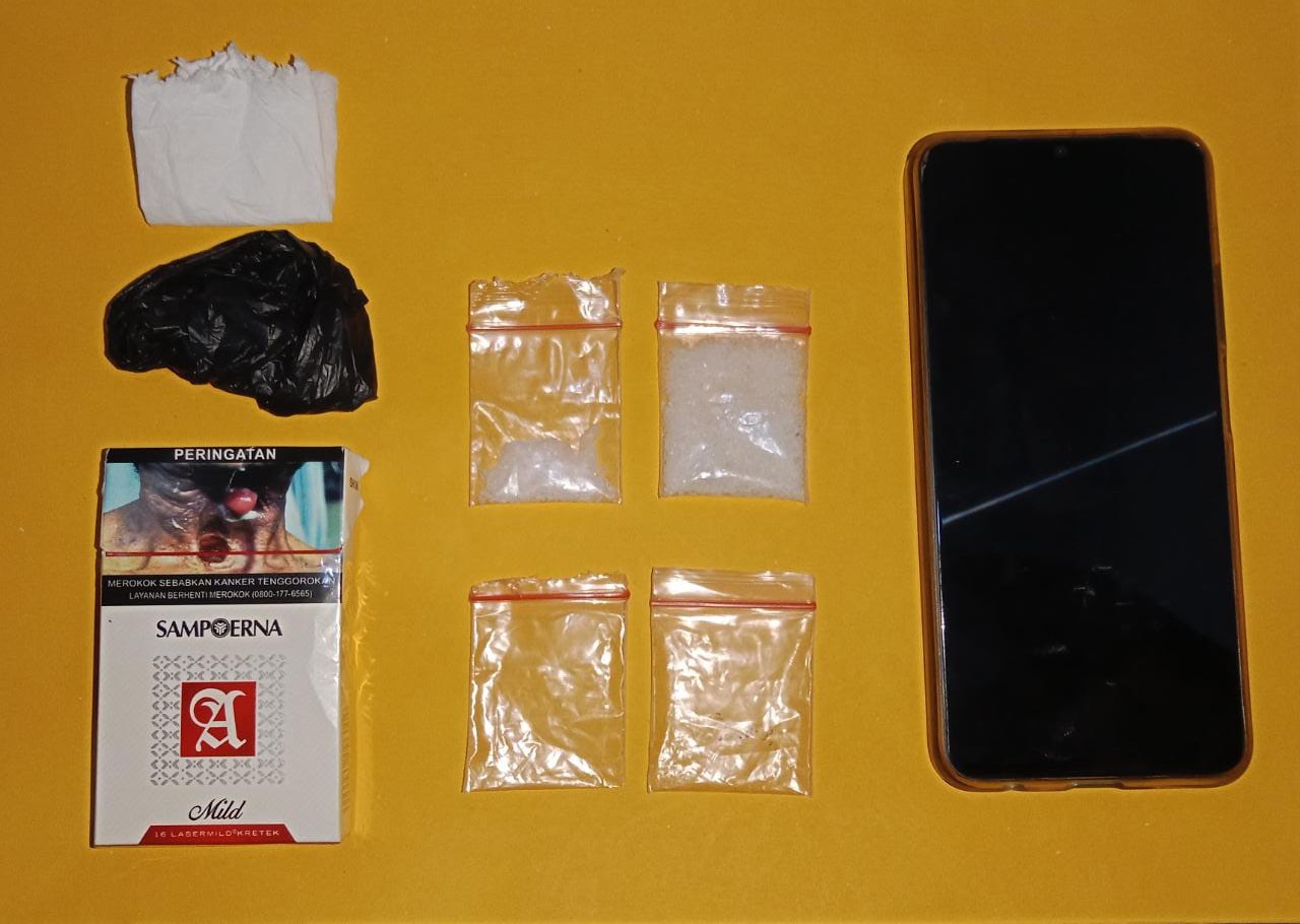 Setelah tersangka diamankan, dengan disaksikan ketua RW setempat anggota melakukan penggeledahan dan ditemukan barang bukti diduga narkotika jenis Sabu sebanyak 2 bungkus plastik bening dengan berat bruto 5,12 gram.