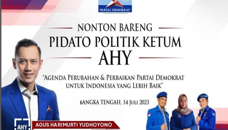 TerabasNews, BANGKA TENGAH – Dewan Pimpinan Cabang Partai Demokrat Kabupaten Bangka Tengah, menggelar kegiatan nonton barang pidato politik Ketum DPP Demokrat Agus Harimurti Yudhoyono, Jum’at Jumat (14/07/23) malam.