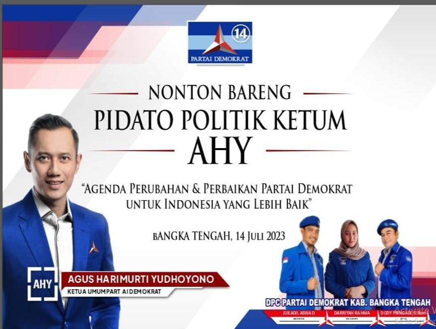 TerabasNews, BANGKA TENGAH – Dewan Pimpinan Cabang Partai Demokrat Kabupaten Bangka Tengah, menggelar kegiatan nonton barang pidato politik Ketum DPP Demokrat Agus Harimurti Yudhoyono, Jum’at Jumat (14/07/23) malam.