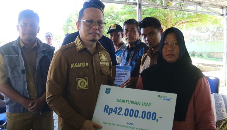 Klaim JKM sebesar Rp42.000.000,- diserahkan Algafry ke pihak ahli waris, yakni Sunarti (selaku istri almarhum nelayan Jana-red), dan bantuan BPJS Ketenagakerjaan kepada 20 nelayan Tanjung Gunung dan 11 nelayan Batu Belubang.