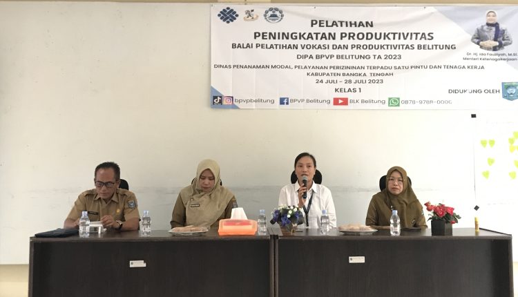 TerabasNews, KOBA – Dinas Penanaman Modal, Pelayanan Perizinan Terpadu Satu Pintu dan Tenaga Kerja (DPMPTK) Kabupaten Bangka Tengah bekerja sama dengan Balai Pelatihan Vokasi dan Produktivitas (BPVP) Belitung, menggelar pelatihan peningkatan produktivitas bagi tenaga kerja yang sudah memiliki usaha baik skala mikro, kecil, menengah ataupun besar, di Gedung Diklat BKPSDMD Kabupaten Bangka Tengah, Senin (24/07/2023).