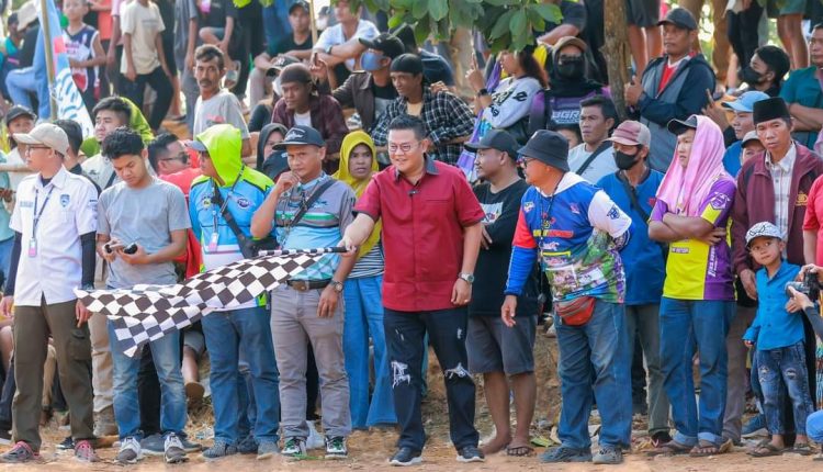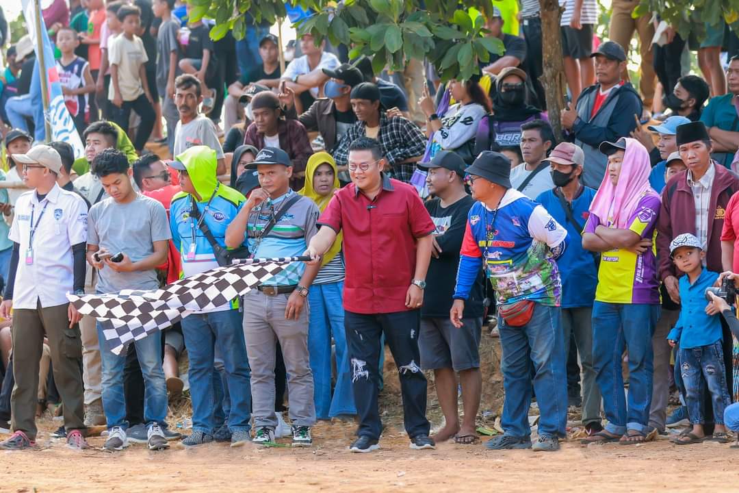 Bupati Bangka Selatan, Riza Herdavid memberikan apresiasi kepada penyelenggara dan peserta para crosser Air Panas Grasstrack Bupati Bangka Selatan Hikok Helawang Cup di Desa Nyelanding.