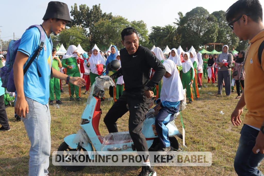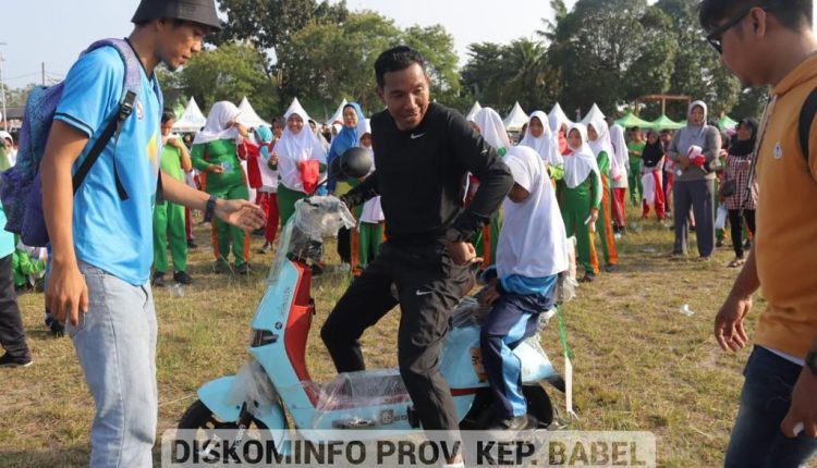 TerabasNews, PANGKALPINANG – Tak alang raut wajah senang terpancar saat Naila dibonceng Penjabat (Pj) Gubernur Kepulauan Bangka Belitung Suganda Pandapotan Pasaribu keliling lapangan menggunakan hadiah utama berupa Sepeda Listrik yang diraihnya saat Doorprize pada Acara Puncak Gule Kabung yang diselenggarakan di Lapangan Sepak Bola Desa Lubuk Besar, Kabupaten Bangka Tengah, Jumat (28/7/2023).