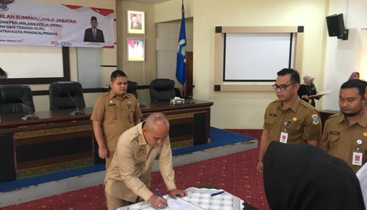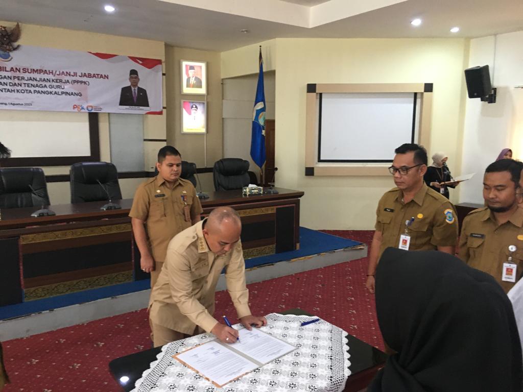 TerabasNews, PANGKALPINANG – Wali Kota Pangkalpinang, Dr. H. Maulan Aklil lakukan pelantikan dan pengambilan sumpah/janji jabatan Pegawai Pemerintah Perjanjian Tenaga Kerja (PPPK) tenaga kesehatan dan tenaga guru di lingkungan Pemerintah Kota Pangkalpinang di Ruang Pertemuan OR Kantor Wali Kota Pangkalpinang, Selasa (1/8/2023).