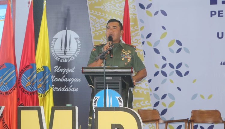TerabasNews, Pangkalpinang-Danrem 045/Gaya Brigjen TNI A.Dedy Prasetyo,S.I.P. sebagai Narasumber pada acara Pengenalan Kehidupan Kampus Bagi Mahasiswa Baru (PKKMB) Universitas Bangka Belitung (UBB) Tahun 2023 dengan tema “Mewujudkan Generasi Muda yang Kompetitif, Kreatif dan Inovatif di Era Merdeka Belajar”, bertempat di GOR Sahabuddin Kecamatan Pangkalanbaru, Kabupaten Bangka Tengah, Senin (14/08/2023).