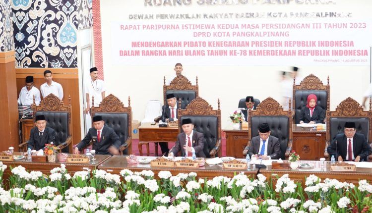 TerabasNews, PANGKALPINANG – Wali Kota Pangkalpinang, Dr. H. Maulan Aklil atau yang akrab disapa Molen memberikan sambutan Rapat Paripurna Kedelapan Belas Masa Persidangan III tahun 2023 DPRD Kota Pangkalpinang dengan agenda Laporan Badan Anggaran dan Penandatanganan Nota Kesepakatan terhadap Perubahan KUA-APBD dan Perubahan PPAS-APBD tahun anggaran 2023 di Ruang Rapat Paripurna DPRD Kota Pangkalpinang, Rabu (16/8/2023).
