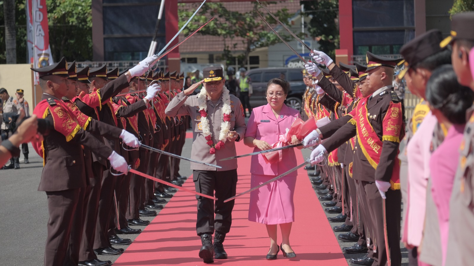Tak hanya itu, sebagai Tradisi Penyambutan Kapolda Baru, Irjen Pol Tornagogo Sihombing bersama Istri turut disambut dengan tradisi Pedang Pora.