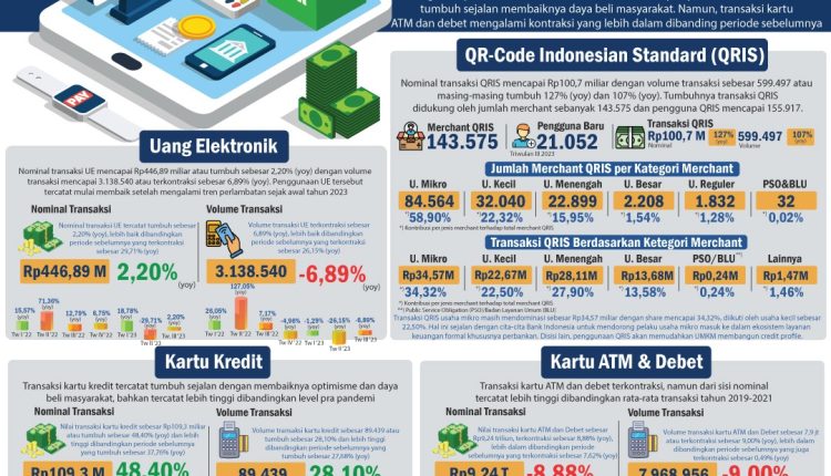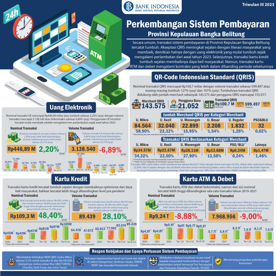 TerabasNews, Pangkalpinang – Secara umum, transaksi sistem pembayaran di Provinsi Kepulauan Bangka Belitung pada periode triwulan III 2023 tumbuh meningkat. Hal ini tercermin dari pertumbuhan di hampir semua kanal pembayaran baik QRIS, Uang Elektronik (UE) dan Kartu Kredit (KK). Namun, transaksi kartu ATM dan debet mengalami penurunan dengan kontraksi yang lebih dalam dibandingkan triwulan II 2023.
