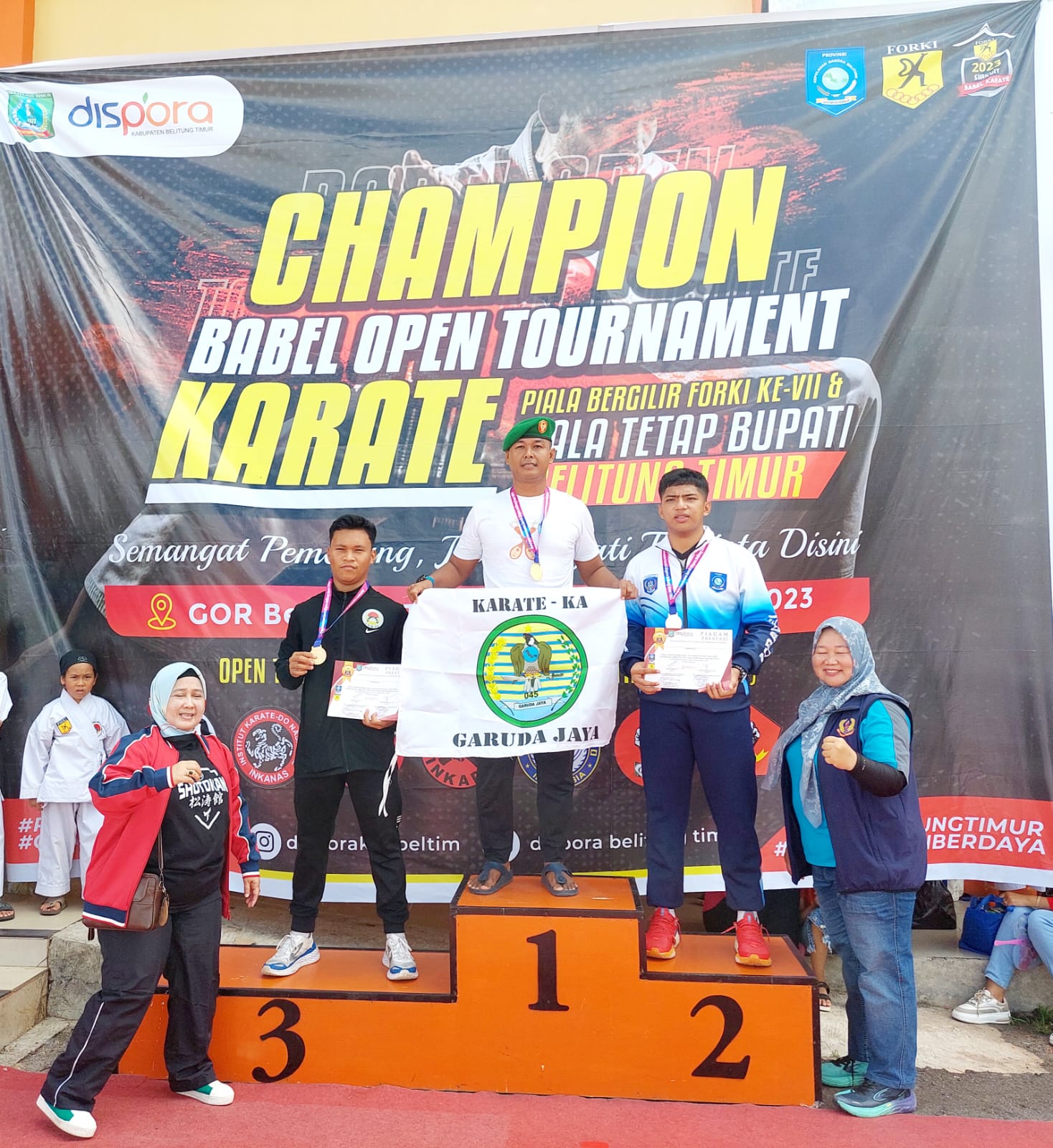 TerabasNews, MANGGAR – Kembali naik podium dan terima Medali Emas dari Bupati Belitung Timur, Burhanuddin, Serda Dedy Supandri kibarkan bendera satuannya, Korem 045/ Garuda Jaya, di GOR Belitung Timur Manggar (17/11/2023).